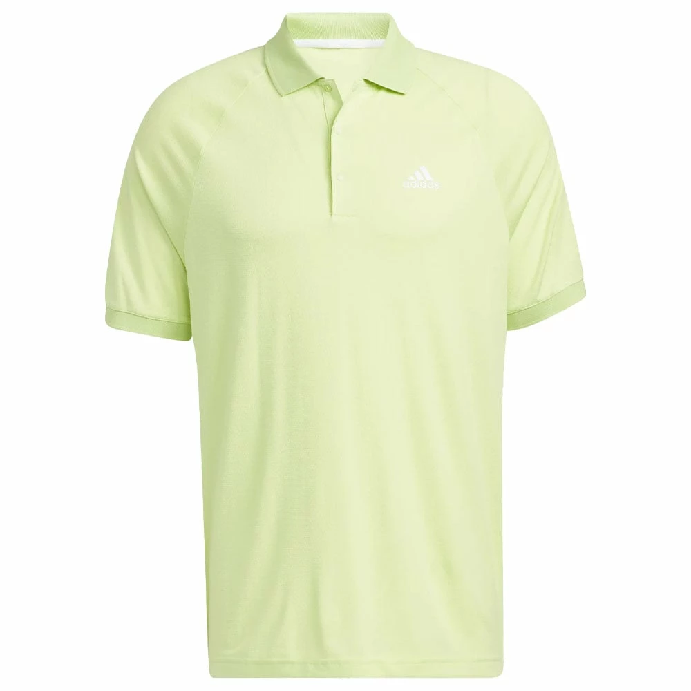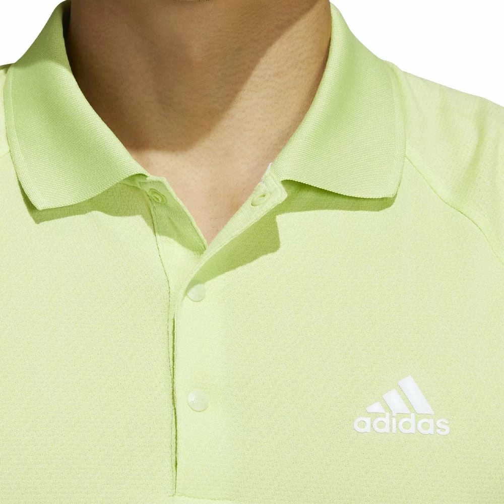 Raglan sleeves let you swing through with no restriction and the ribbed cuffs give extra stretch. The heathered design with tonal collar and cuffs gives it modern style. The polo is finished with a 3-button placket and adidas logo on the chest.